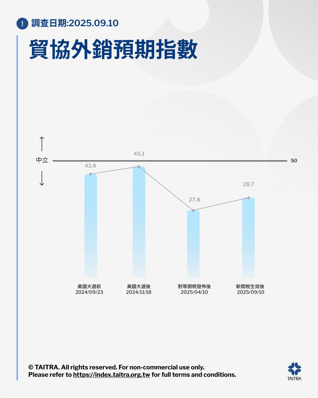 相較於當下,台灣企業對「未來」的外銷預期趨勢則有止跌回升跡象,持平但些微進步。