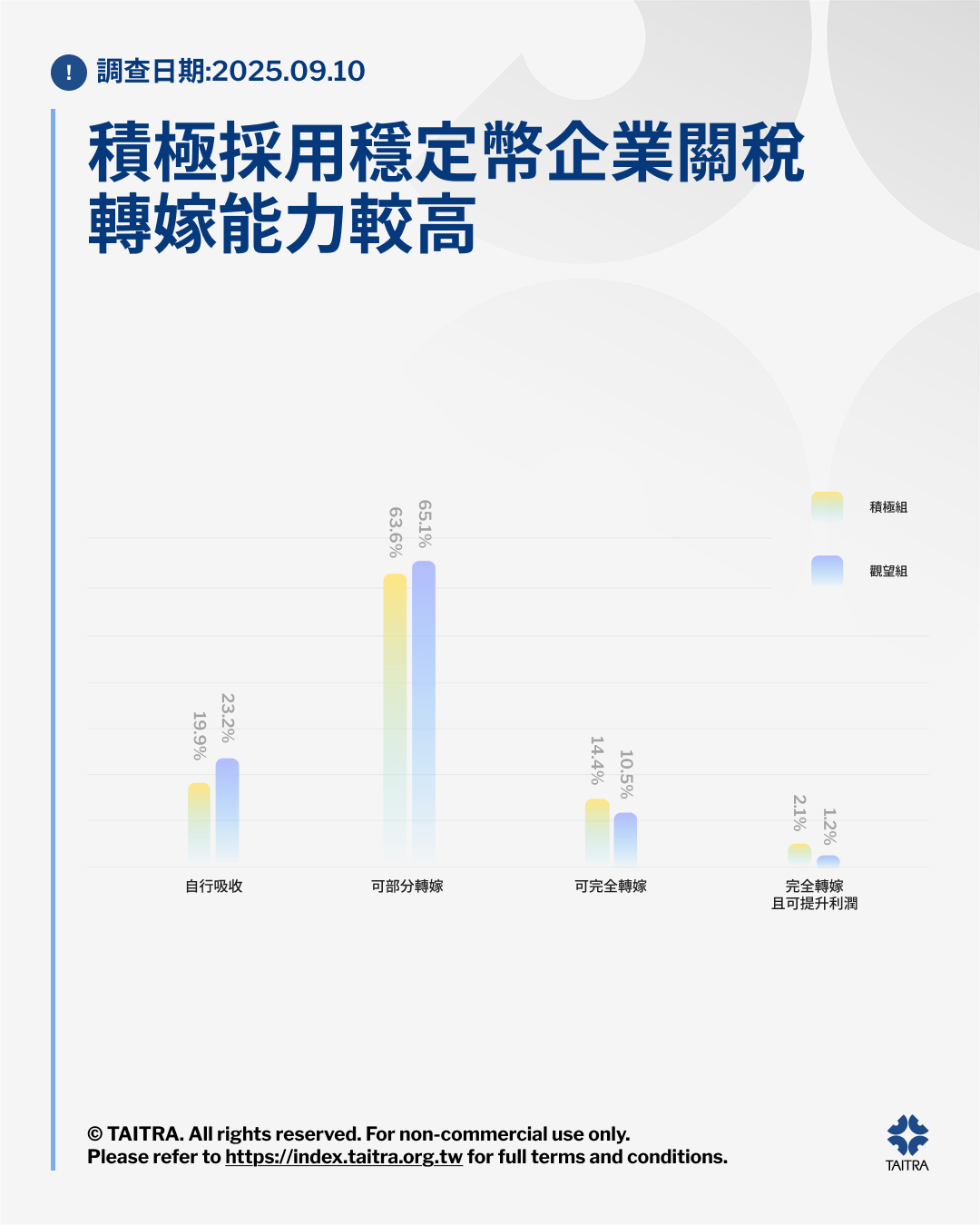 積極採用穩定幣的企業對景氣展望的樂觀程度,以及對關稅成本完全轉嫁的能力,均顯著高於對穩定幣態度保守的企業,